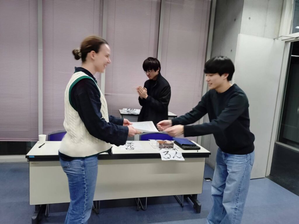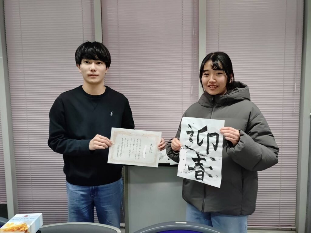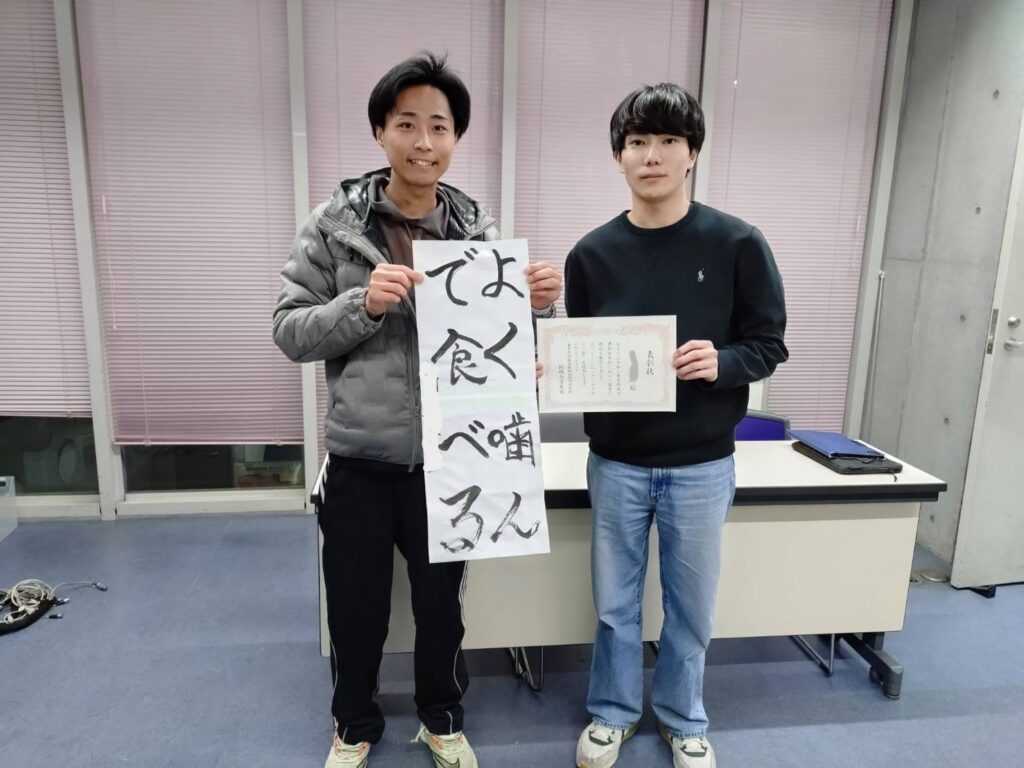 ちょうど先端生命科学専攻の研究室訪問に来ていたアメリカ人の学生も参加してくれました。久しぶりに嗅ぐ墨の香りがエモいです。学生部から3名の方に賞状と記念品が授与されました。