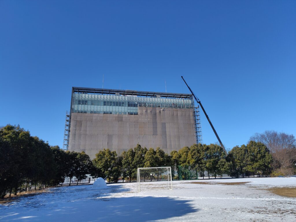 現在新領域生命棟は外壁改修工事中です。今日も寒い中の高所作業、お疲れ様です。